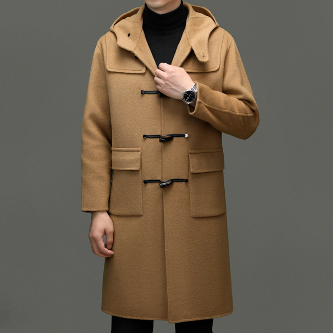 A timeless camel duffle coat crafted from 100% wool, featuring signature horn-buckle toggles and a modern hooded design. Warm, structured, and effortlessly refined for everyday autumn wear.